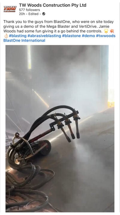 The implementation of the VertiDrive with a MegaBlaster yielded exceptional results. The blasting speed soared to an impressive 55-65m² per hour, surpassing the client’s expectations. T W Woods Construction Pty Ltd not only experienced a remarkable increase in efficiency but also appreciated the reduced noise levels, particularly with the SnakeBite Nozzles.