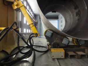 Moreover, the robot is programmed to coordinate the rolling of the tower in conjunction with the blast nozzle. In this facility, blasting is done sector by sector: the robot moves from one end to the other, where the roller bed rotates the tower element. This leaves a slight overlap on the blasted sector before the robot returns. Concurrently, the tower element rotates around.