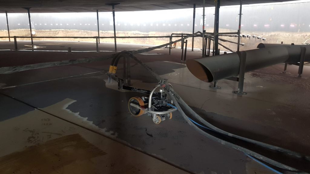 For this operation, we proposed the use of VertiDrive M7. This advanced abrasive blasting robot, armed with 2 #8 Ultra Tuff nozzles and supported by an 8-ton bulk pot, was perfectly suited for this challenging project. Utilizing GMA PremiumBlast garnet as the abrasive at 92 psi, the VertiDrive M7 was geared to deliver optimum results.