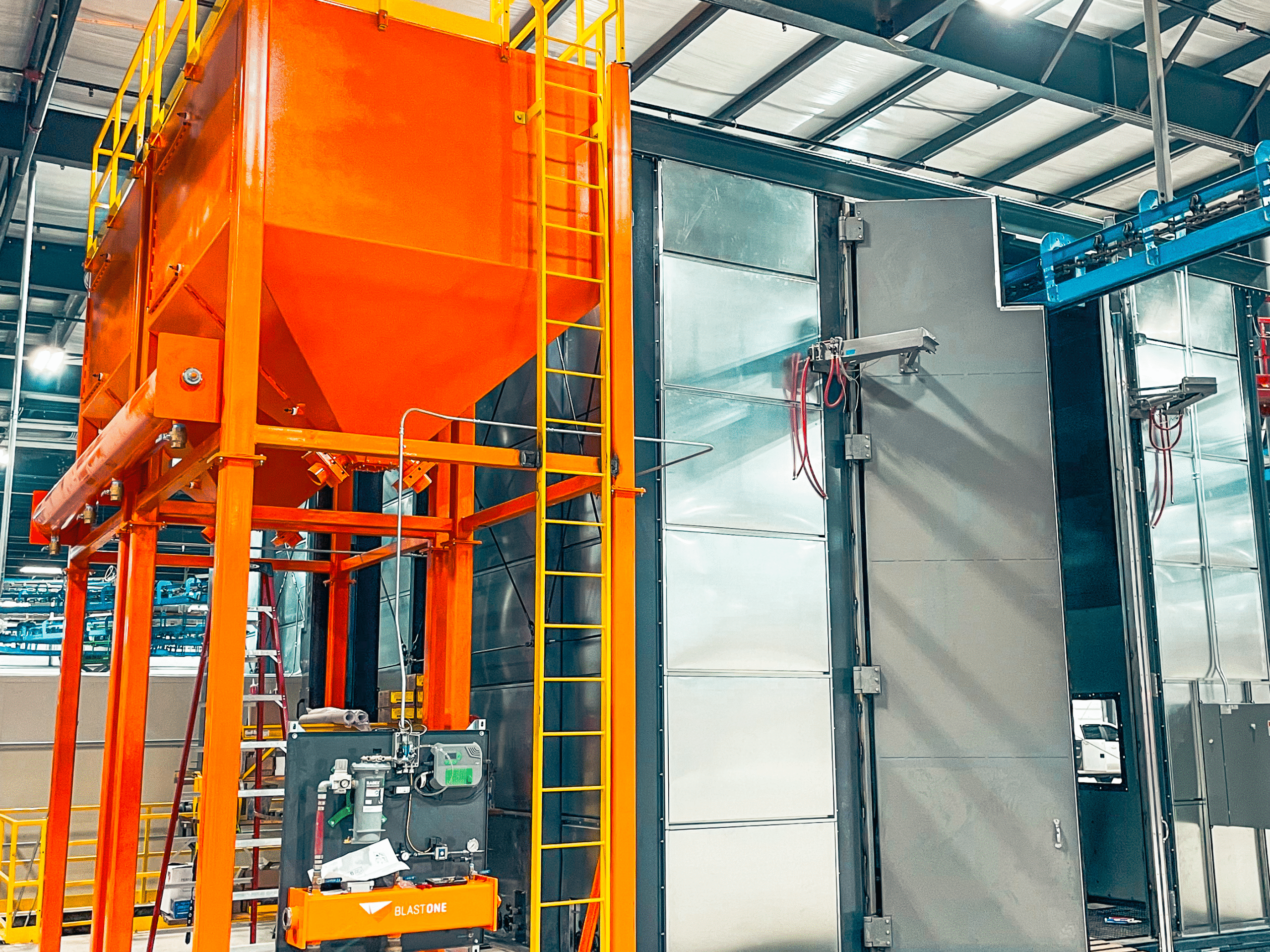 The synchronized robotic systems were engineered to work in harmony, achieving a consistent and high-quality finish within the projected cycle time. BlastOne also installed a fully automated abrasive recovery system, which featured oscillating conveyors, a high-capacity bucket elevator, and an airwash system for optimal abrasive recycling. This system ensured that the booth ran efficiently, with minimal environmental impact, while reducing labor demands and improving safety by limiting personnel entry into confined spaces.