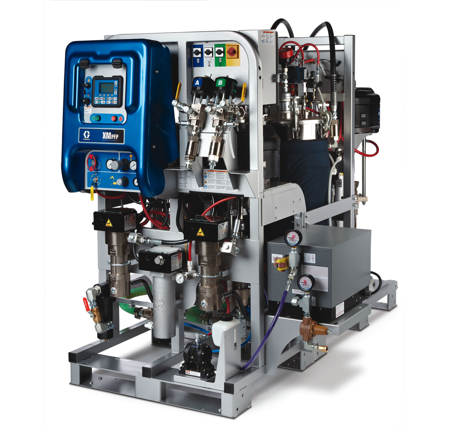 GM262869The Graco XM PFP Plural Component Sprayer (SKU: GM262869) is a complete system designed for Passive Fire Protection (PFP) coatings, ensuring precise ratio control and consistent temperature management. Built on the Graco XM sprayer platform, this unit includes heated hopper feed modules, dual heated hoses, a remote mix manifold, and an XHF spray gun, making it ideal for applying high-viscosity fireproofing materials. Key Features: