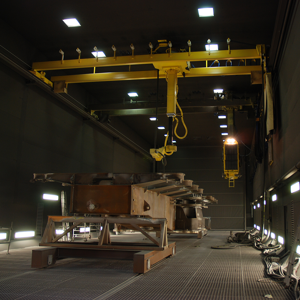 Blasting robots Typical industrial abrasive robotic systems require fixed, purpose-built infrastructure to operate. This level of infrastructure investment means that blasting robots are mostly used in mass manufacturing settings, such as railcar, steel fabrication, and automotive industries. BlastOne specializes in designing, building and commissioning blasting facilities to provide custom blasting robots solutions for our customer’s corrosion control needs. Each sand blasting robot can be custom fit to each facility based on applications needs. Contact us to begin the discussion on which abrasive blasting robotic solution can most benefit your business.
