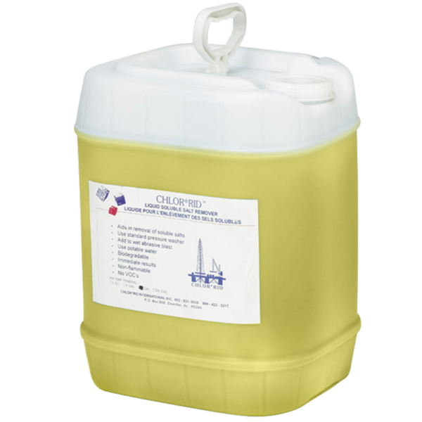 Protect your coatings with Chlor*Rid Liquid Soluble Salt Remover, a biodegradable solution that removes harmful chlorides, nitrates, and sulfates from steel surfaces. Used during surface preparation, it ensures optimal coating performance by preventing salts from embedding into profiles during blasting.