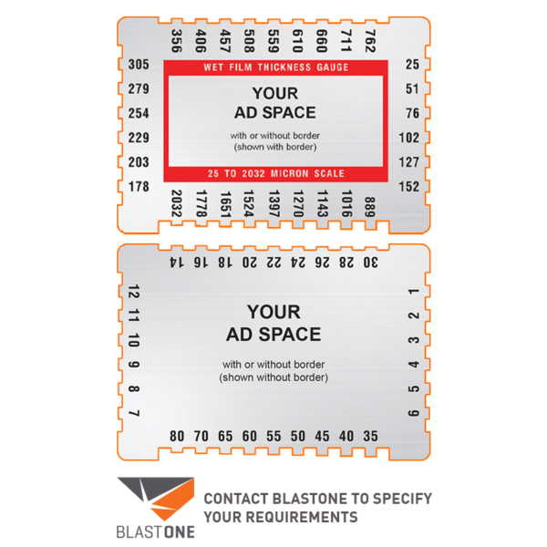 Build your brand. Use your logo. Get your own branded WFT Gauges to promote your services and make and impression. STEP 1: Fill out Request for quote form STEP 2: Customer returns completed form, high resolution artwork, fonts and colour choices to BlastOne STEP 3: BlastOne will quote (Part No: INB115ALC) based on quantity, and colours, and provide artwork proof for customer to sign. STEP 4: Order processed STEP 5: Allow 5-6 weeks delivery Note: Payment required with order for Custom branded products. Low cost measurement of wet film thickness using a wet film comb.- Used in accordance with Australian standard AS 3894.3—2002. Site testing of protective coatings. Method 3: Determination of dry film thickness.