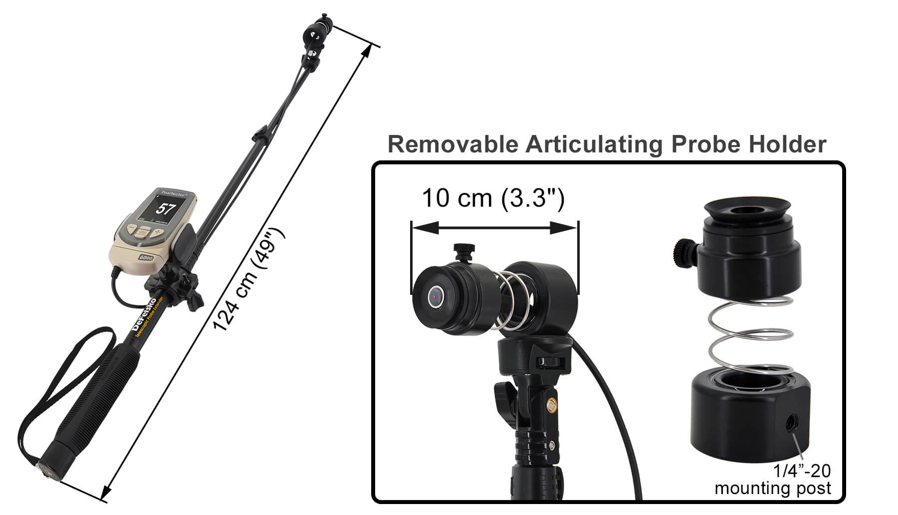 The DeFelsko® Telescopic Probe Extender is engineered to provide an extended reach for DeFelsko® DFT Probes, supporting up to 1.24 meters in length. This capability is essential for accessing and measuring in areas that are otherwise difficult to reach, ensuring thorough and accurate inspections. For ease of transport and storage, the device can be collapsed to a compact size of 40 cm. A key feature of the extender is the Spring Adapter, which ensures the probe applies a consistent level of force against surfaces, necessary for accurate measurements. Additionally, the device is equipped with a probe holder that allows for articulation in any direction, offering flexibility in measurement angles and positions.- Provides extended reach for DeFelsko® DFT Probes, facilitating access to difficult areas