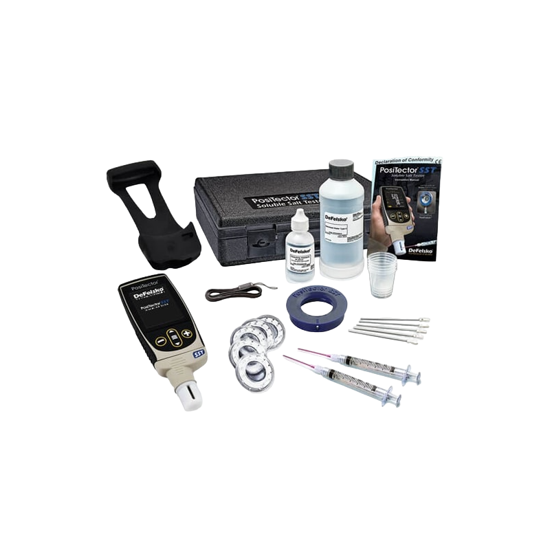 The DeFelsko® PosiTector® SST is an essential tool for professionals focusing on surface cleanliness and preparation. It offers a reliable method for measuring the concentration of soluble salts, crucial for assessing surface conditions before coating. With adherence to ISO 8502-6 and 8502-9 standards, this device ensures that your testing meets international quality benchmarks. Key Features:- User Interface: The device's large 2.8" touchscreen facilitates an intuitive testing process, simplifying the Bresle method application.