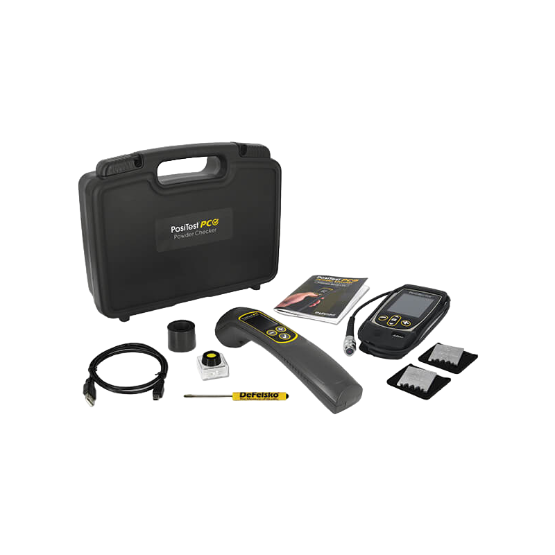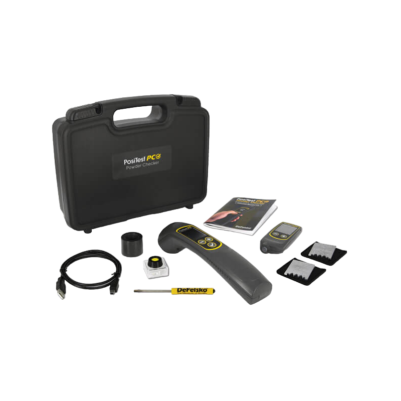 The DeFelsko PosiTest® PC – Powder Thickness Gage (SKU: P-INDPCKIT) is a state-of-the-art tool for predicting the final thickness of powder coatings before curing. Designed for industrial environments, this non-destructive gauge improves efficiency, accuracy, and usability in powder coating applications, making it a must-have for manufacturers aiming to ensure quality and consistency. Key Benefits and Features: Simple and Easy-to-Use: The dedicated, standalone design requires minimal learning and no calibration for most powders, allowing operators to focus on production. Durable Construction: Resistant to solvents, acids, oils, water, and dust, it is built for harsh powder environments. Accurate Measurements: An upgraded sensor improves accuracy on complex geometries, small tubes, and moving parts. The gauge complies with ASTM D7378 standards for powder thickness measurement. Enhanced Storage and Reporting: With a memory capacity of 999 readings and on-screen averaging, operators can analyze results directly on the device. Data can be transferred seamlessly to PosiSoft Desktop Software via the included USB cable. Flexible Kit Configurations: Choose the kit that suits your inspection needs:- PosiTest PC Dedicated Kit: Includes the PC device, zero probe fixture, protective lens, carry case, and essential accessories.