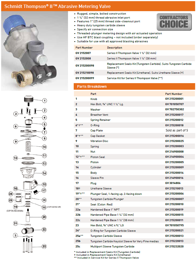 - The Thompson Valve 2 is suitable for use with all approved blasting abrasives