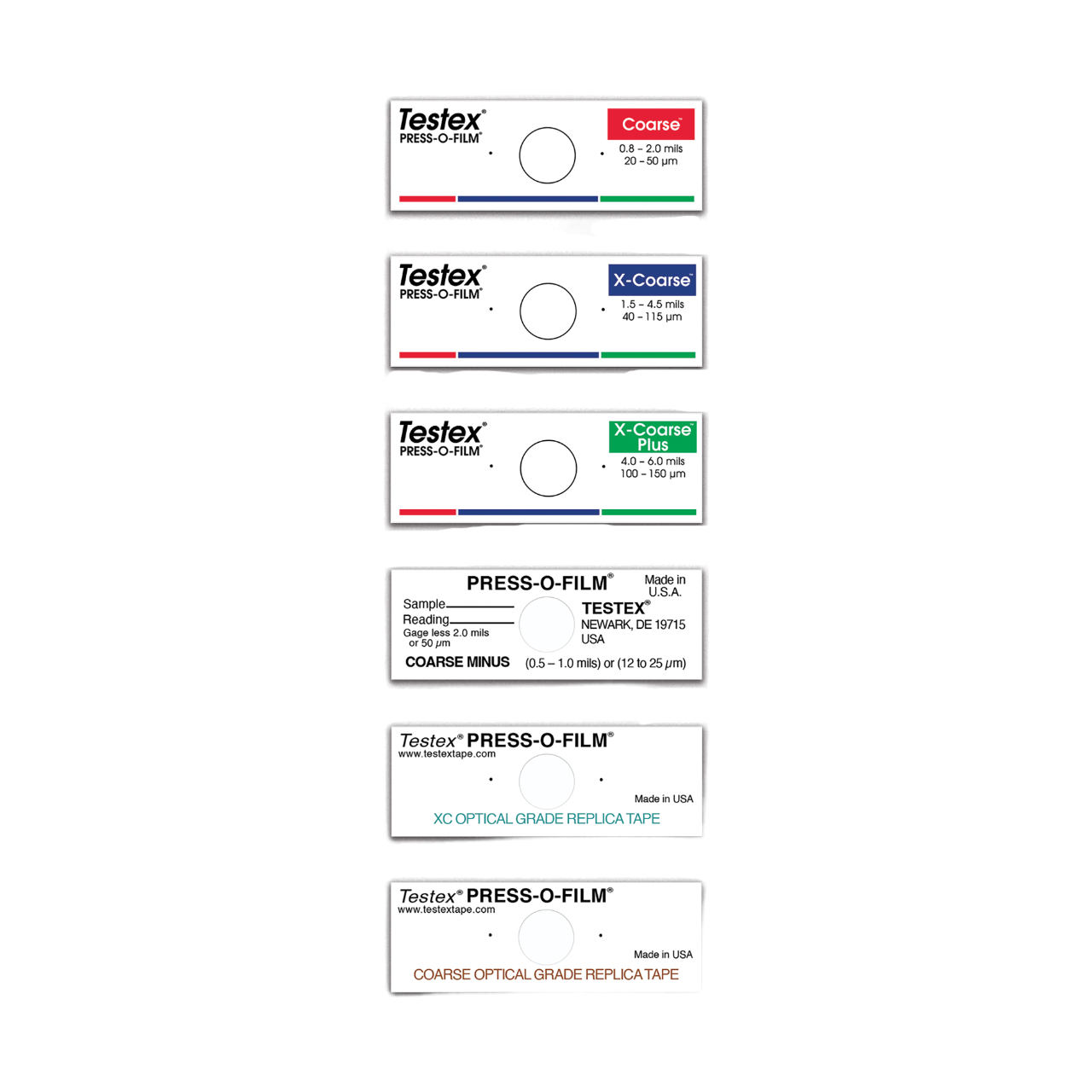 Testex Press-O-Film Conventional Testex tape is available in a variety of thickness ranges for measuring substrate roughness using analog or digital micrometers. It is available in the following:- Coarse Minus.