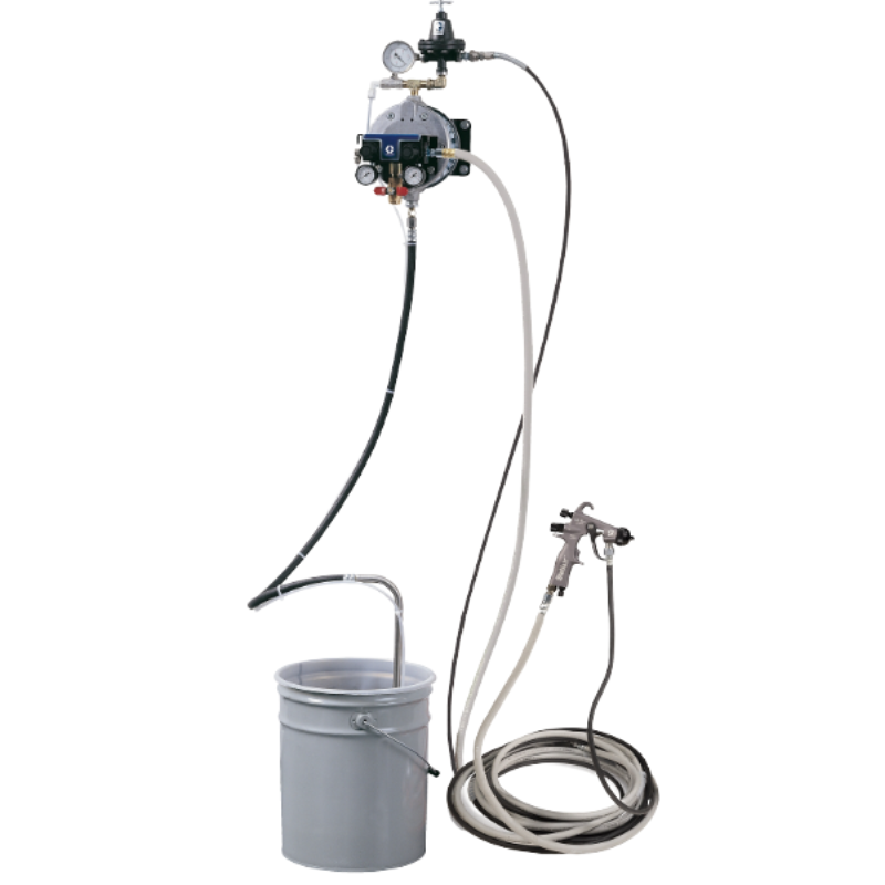 In the past, most industrial paint shop's "weapon of choice" for conventional spraying was a pressure pot. Upgrading to a Warrior Sprayer is a breeze. Using your existing hose and gun setup, the warrior pump uses a double action piston pump to spray quickly and smoothly. Simply place the pick up tube into your paint can and you can be spraying in two minutes. Cleanup is a cinch! Put the suction tube into your solvent can and place the pump in re-circulate mode. Once the pump is clean flush out the gun and lines. Normally the only clean-up required on the pump itself is the pick-up tube. Unless you've splashed paint over the rest of the pump! Solvent usage can be cut by up to 75% of that required for pressure pots. You can change colors in under five minutes. Need to agitate your coating? Easy, just add-on an air powered agitator right onto the Warrior.Specifications