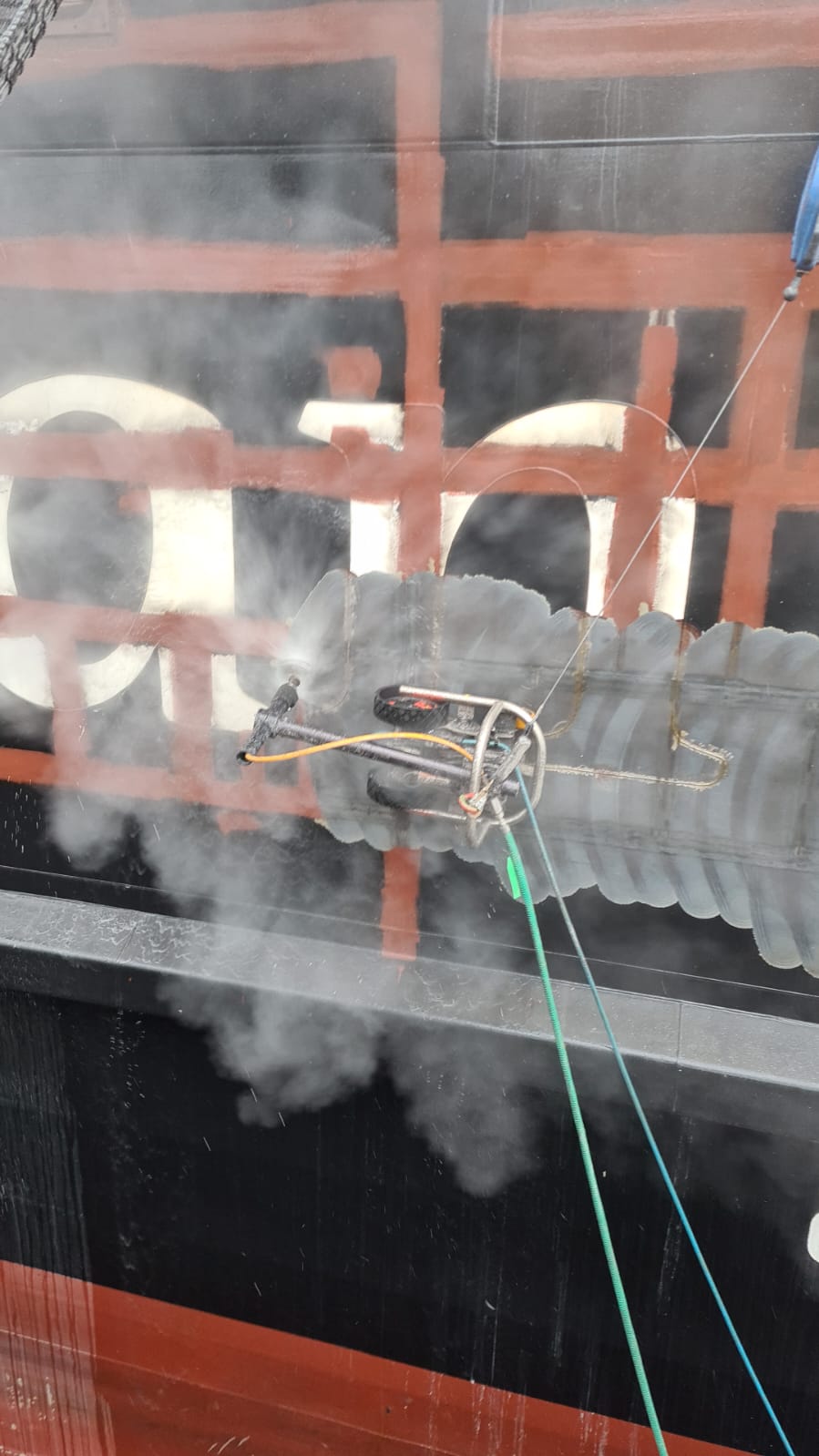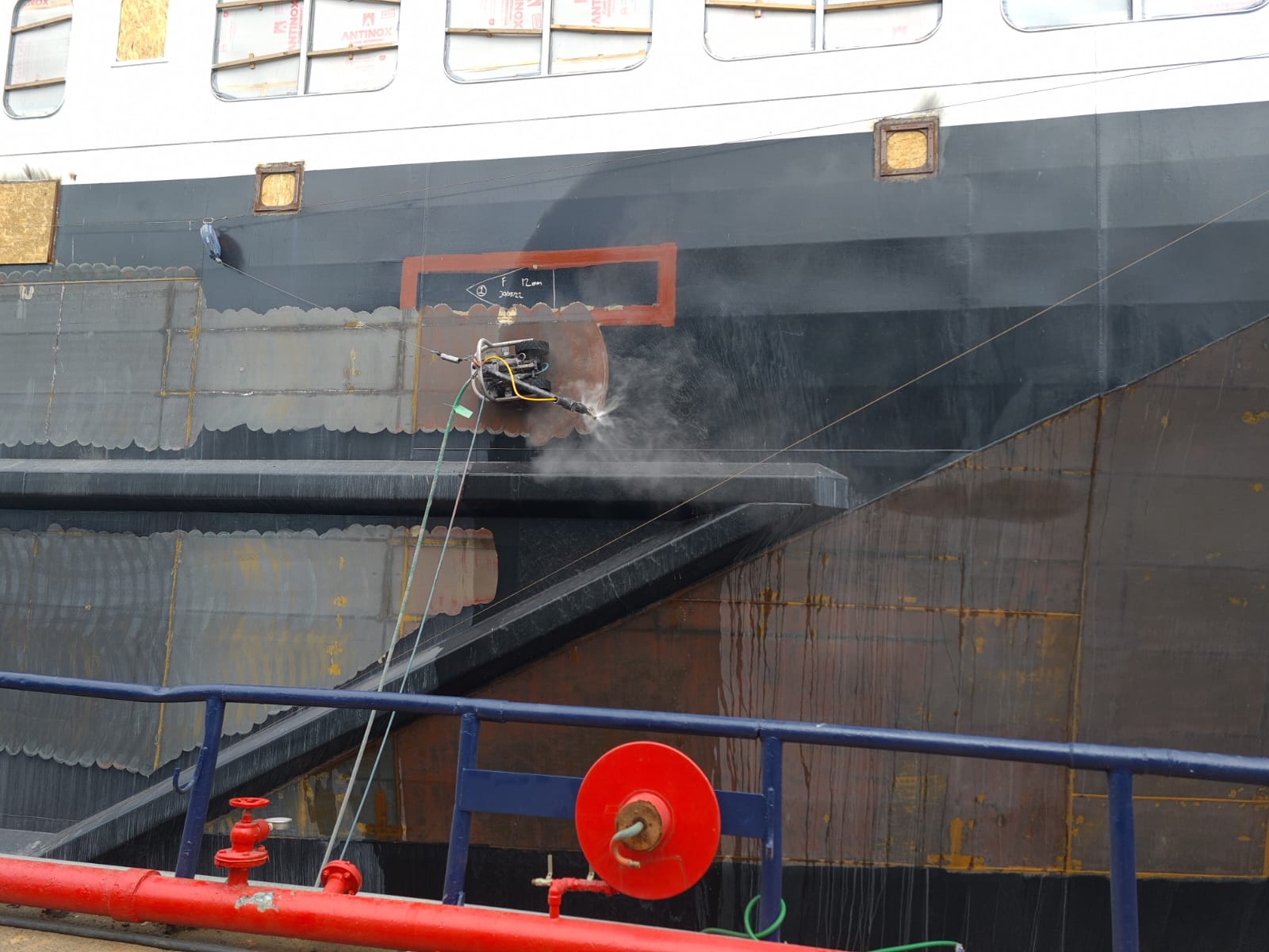 BME Services successfully completed the Glen Sannox ferry boat’s top-side project within eight days, deploying two staff members for the project, one robot operator, and one pump operator. The use of UHP water blasting and the VertiDrive M7 robot allowed BME Services to complete the project faster, safer, and with consistent quality. An average of 1345.5 ft2/day (125 m2/day) was achieved, considering the inevitable pressure drop of the water as it has to flow all the way to the top side of the boat, it is significantly higher than the 269 ft2/day (25 m2/day) that would have been accomplished using traditional manual blasting methods.