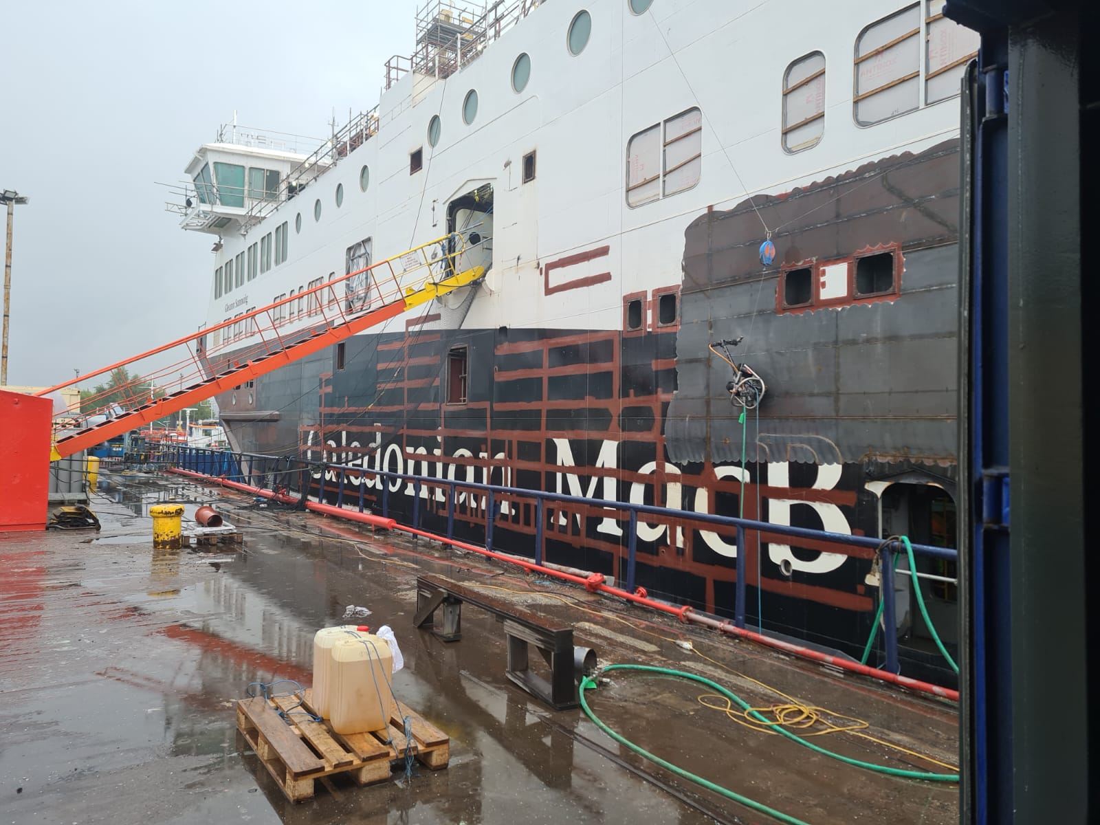 CalMac – Caledonian MacBrayne contracted BME Services to remove a four-layer Jotun epoxy coating system from the top side of the Glen Sannox ferry boat. The Glen Sannox ferry boat had dimensions of 1102 ft x 183 ft (102.4 x 17 meters) and a total area of 21,527.8 ft2 (2,000 m2) Traditional manual blasting methods would have been time-consuming, and working at height could have been unsafe for the operators. The four-layer Jotun epoxy coating system had a thickness of approximately 1,000 microns.