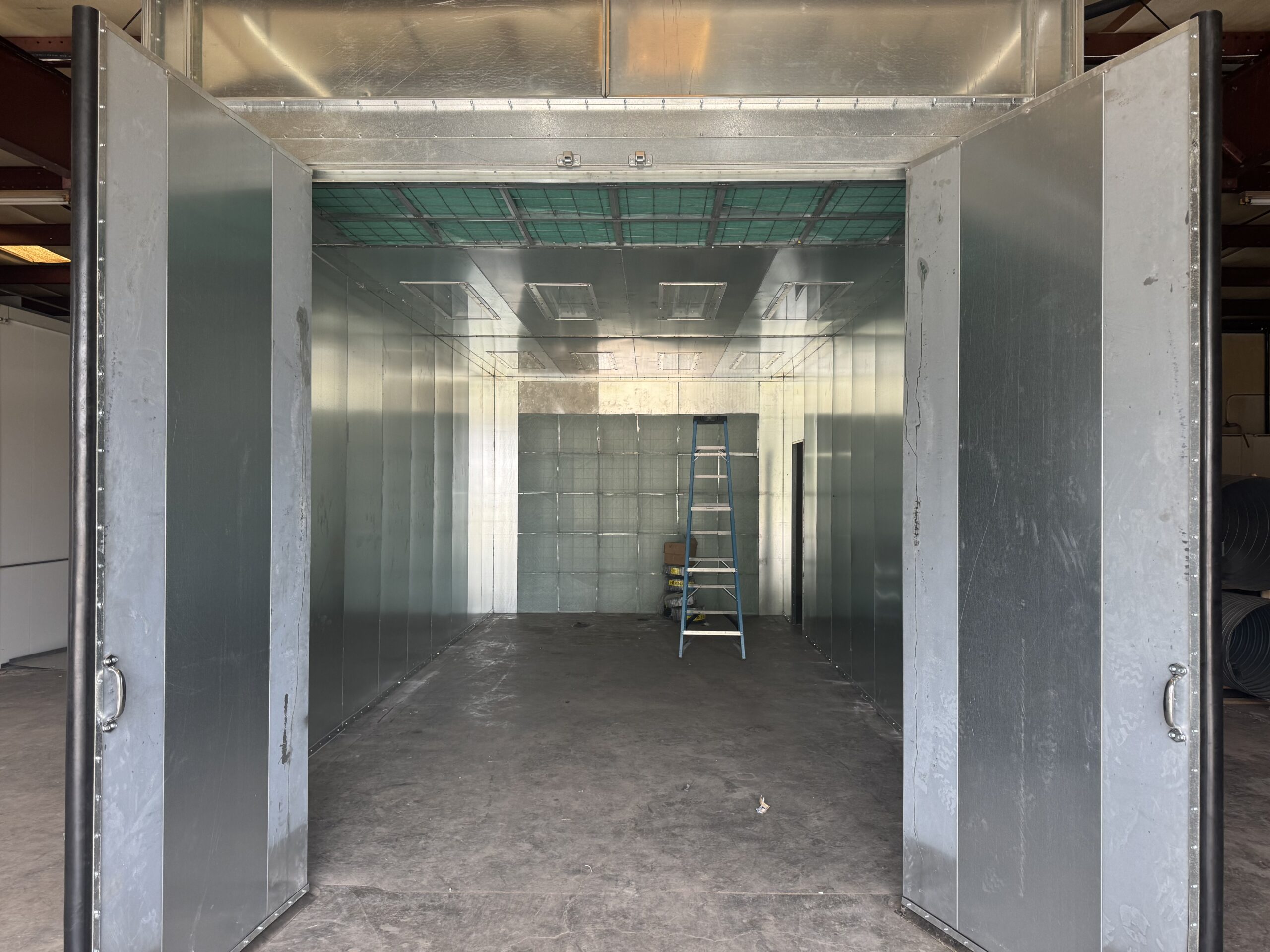The paint booth was designed with similar dimensions to provide flexibility in the production line, equipped with double-swing product doors, a semi-downdraft ventilation system, and a high-powered blower motor for efficient airflow. The booth was also integrated with a make-up air unit for temperature control, allowing for consistent and high-quality paint application. The paint booth setup included a paint mix room to ensure the proper handling and mixing of paints, further contributing to safety and efficiency.